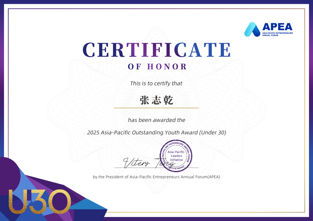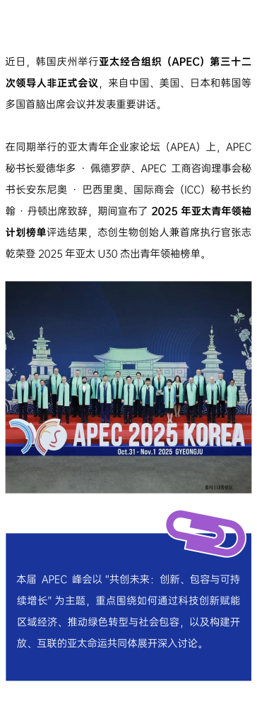 APEC峰会重磅发布!态创生物张志乾荣登2025年亚太U30杰出青年领袖榜单